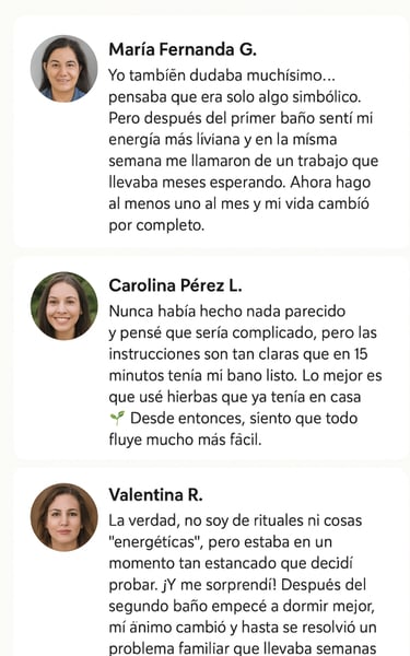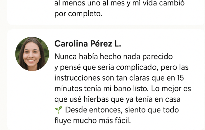 En este bono recibirás las 3 fórmulas de baños de emergencia más poderosas que utilizo con mis clientes VIP. Imagina tener siempre a mano un «botiquín energético» para usar antes de esa reunión importante o después de un día pesado.
